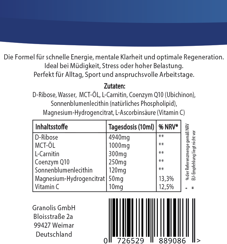 Zellstoffwechsels mit D‑Ribose, MCT‑Öl, L‑Carnitin, Coenzym Q10, Magnesium und Vitamin C.